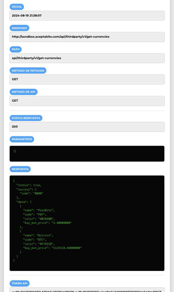 TOKEN API: Aquí se muestra el Token API que se utilizó en el header de autorización.